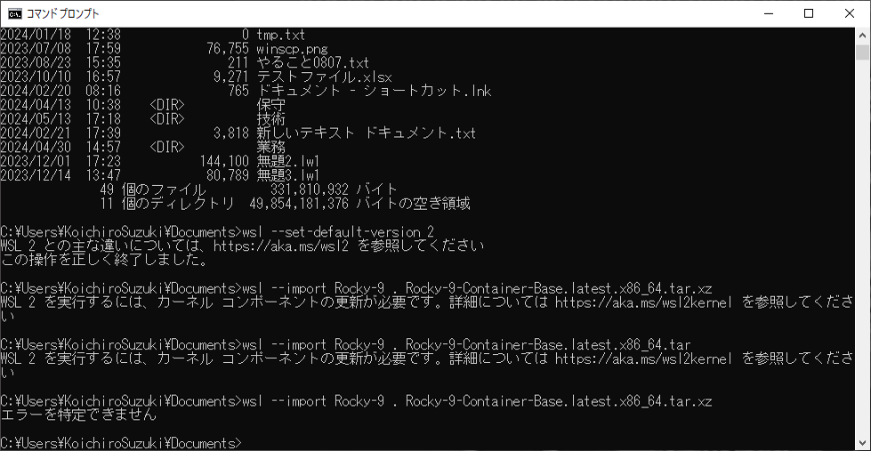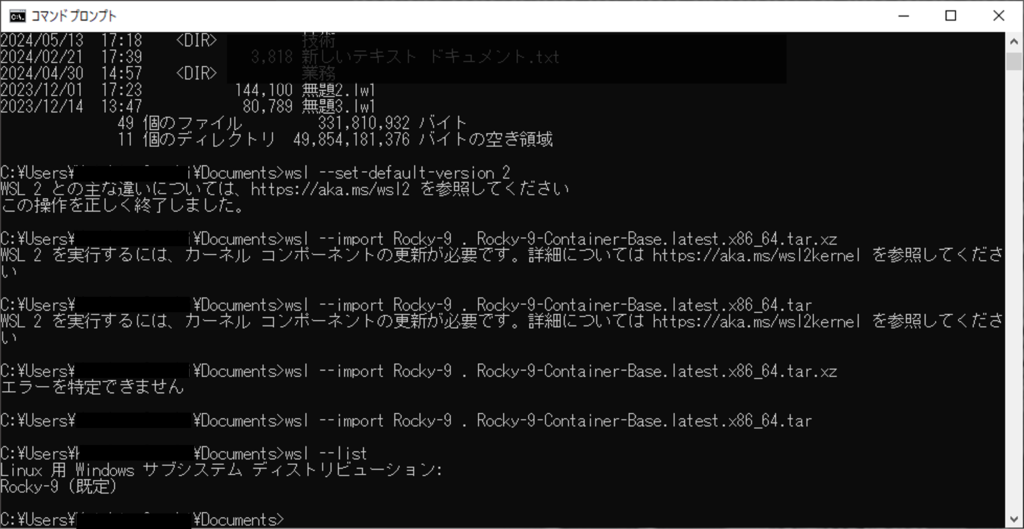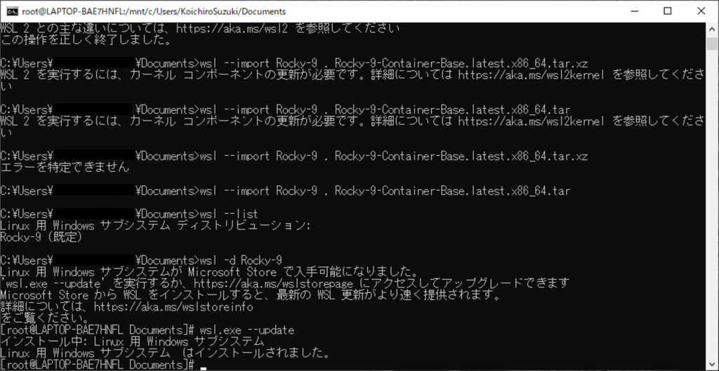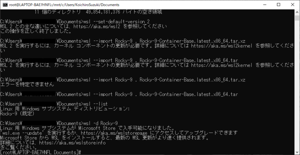 (ちなみに、イメージファイルを格納したディレクトリでwslコマンドを実行しているので <path-to-vm-dir> には . を指定しています。また、–import で指定している名前は、wslで呼び出す際に使用するディストリビューション名です。今回は Rocky-9 という名前を付けました)