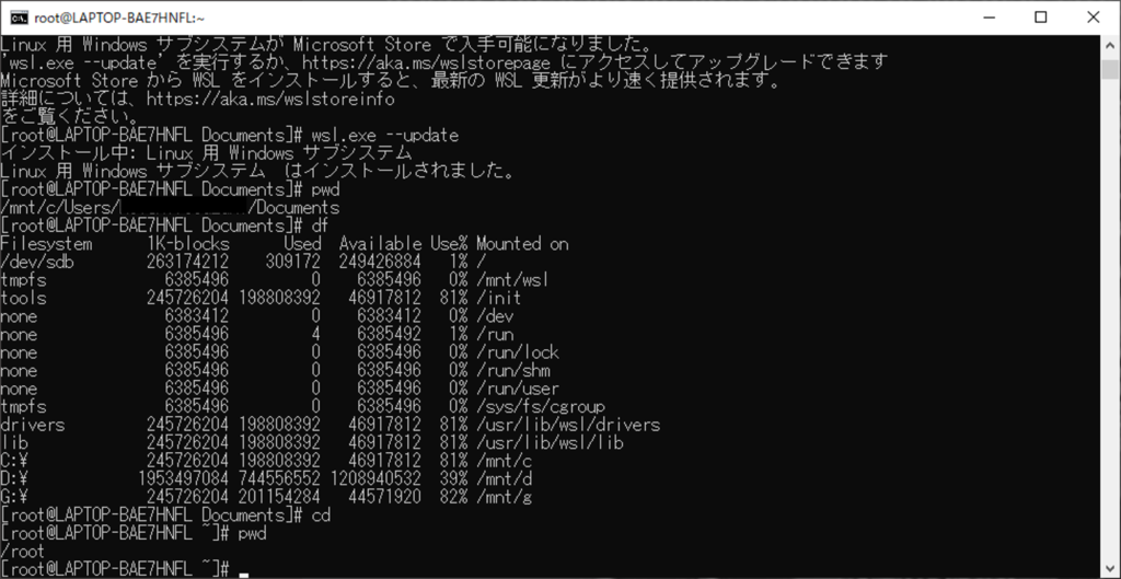 今回、wslコマンドでインポートを行ったときのカレントディレクトリ(フォルダ)は、