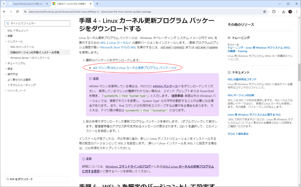 メッセージに従い、https://aka.ms/msl2kernel を参照して、最新の x84マシン用WSL2 Linuxカーネル更新プログラムパッケージ をclickして、ダウンロードします。