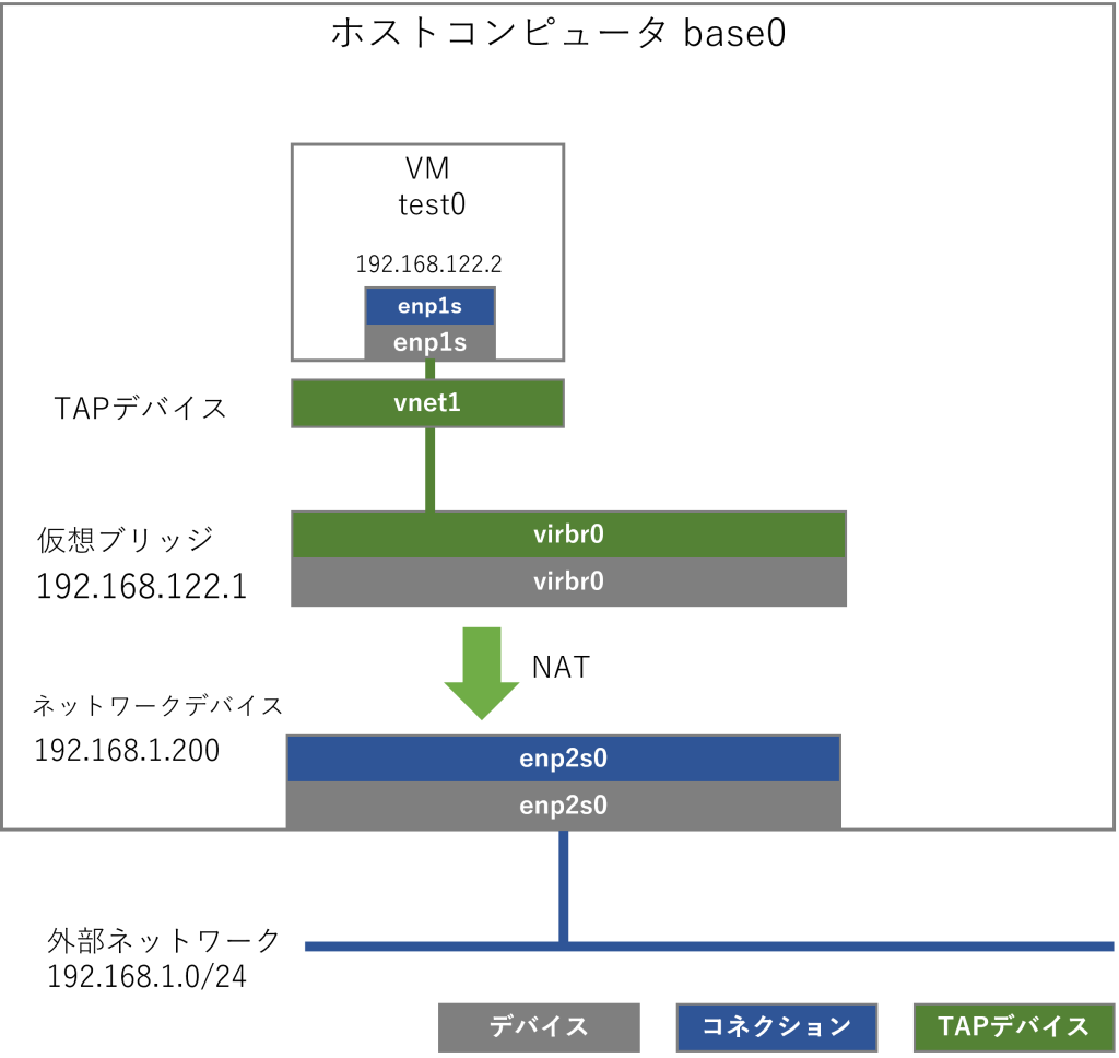 仮想マシン(VM)は、ホストコンピュータのvirbr0をゲートウェイとして外部のネットワークと接続することができます。仮想マシンは、外部ネットワークのIPアドレスを持たないので、NAT接続で外部と通信します。