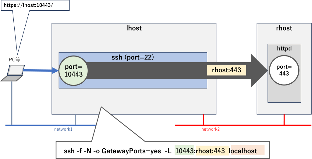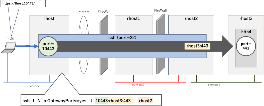 sshコマンドの引数にrhostを指定しているので、sshクライアントはrhostに対してsshトンネルを作成して、更にlocalhostのport=443のサービスに接続しています。