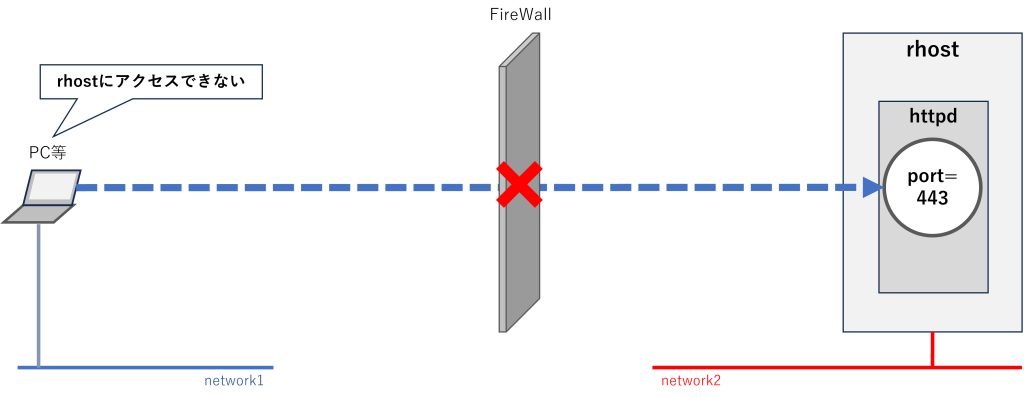 FireWallはセキュリティの脅威から、企業内のネットワークを守るための機能です。企業内ネットワークからインターネットへのアクセスは比較的自由な通信が可能ですが、インターネットから企業内ネットワークへのアクセスは、接続元IPアドレスや接続portが制限されていることが一般的です。