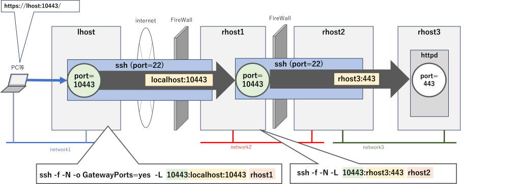 2番目のsshトンネルでは、rhost3のport=443をrhost1のport=10443に転送しています。