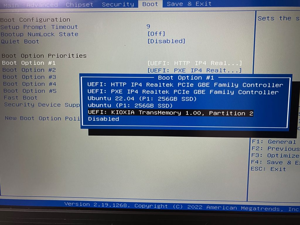 変更前の設定では、Boot option #5 に USBフラッシュメモリ(UEFI: KIOXIA TransMemory)が設定されていますので、Boot Option #1 に USBフラッシュメモリを設定します。