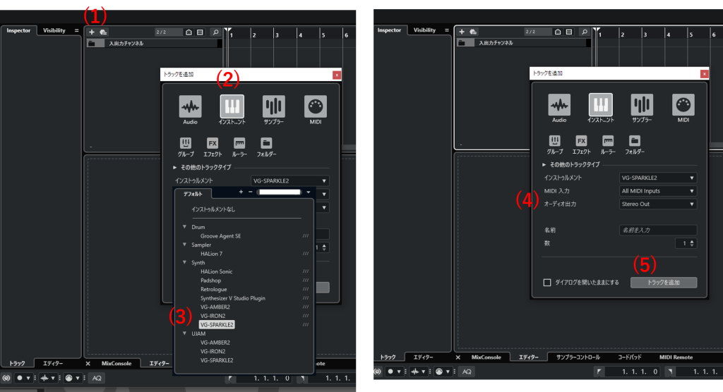 音を出すには、Virtual Guitaristの音を鳴らすトラックが必要なので、以下の手順でVirtual GuitaristのVSTプラグインをトラックとして追加します。今回はSPARKLE2を組み込んでみます。