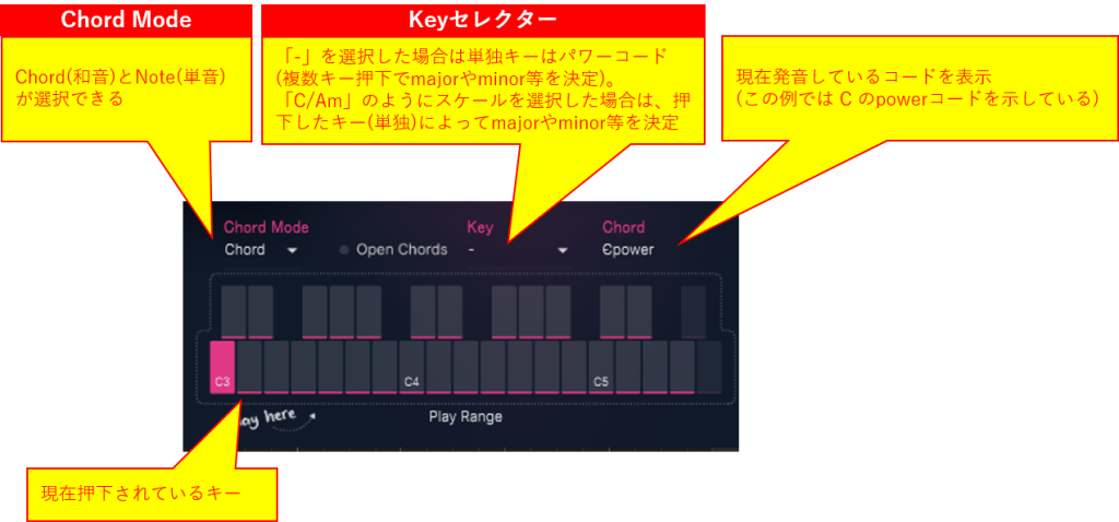 Chordを選択すると、C3~F5の中のキー1つでその音階に対応した和音を鳴らします。