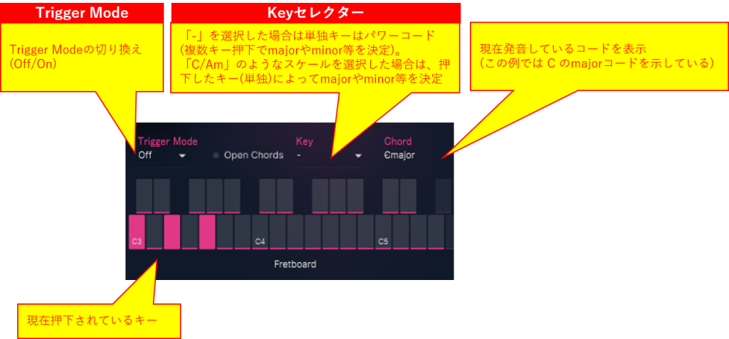 Trigger ModeをOffにすると、C3~F5のキーはホールドしている間、指定されたコードを発音するスイッチとして機能します。更に言えば、C3~F5のキーだけで発音することはできず、D1~B2のキーの指定した弾き方によって発音します。発音の長さを決める要素は、C3~F5のキーのリリース長(ホールドしている時間)、またはC#2(リリース)を押下するまでの時間で決まります。C#2キーは、明示的に無音部分を挿入してそれまでに鳴っていた音を止めます。