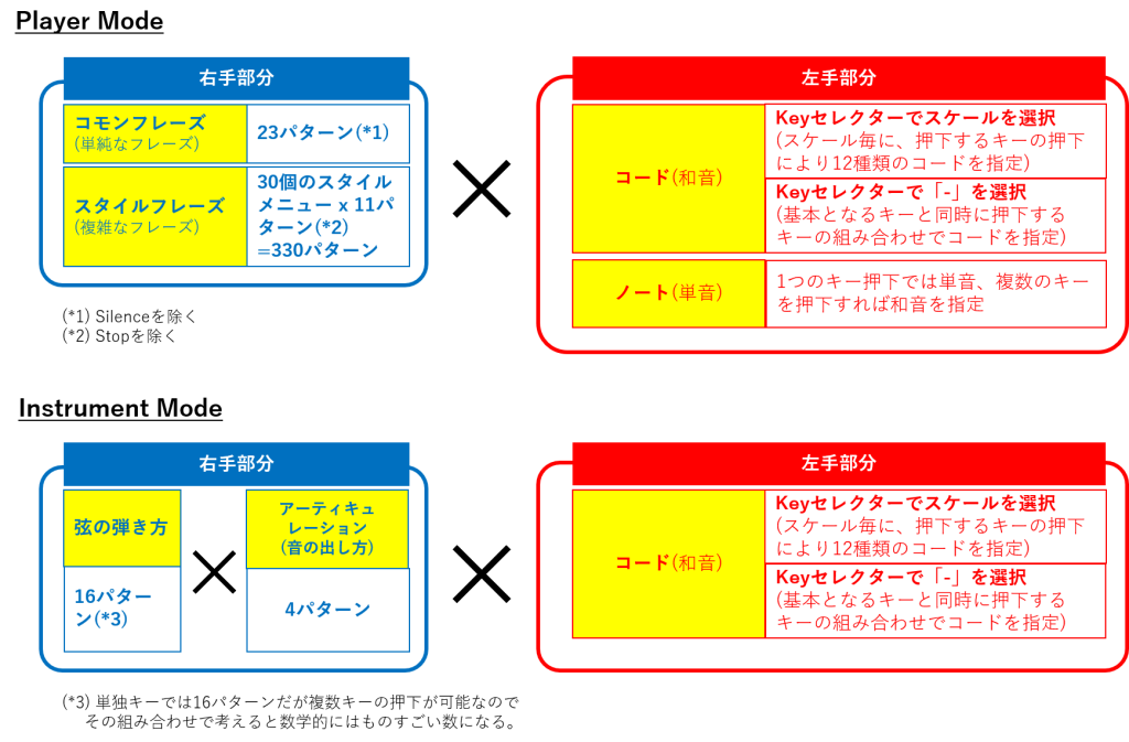 Player ModeとInstrument Modeのそれぞれの音の出し方を考慮した上で、演奏パターンの組み合わせを整理してみると、以下の図の通りとなります。