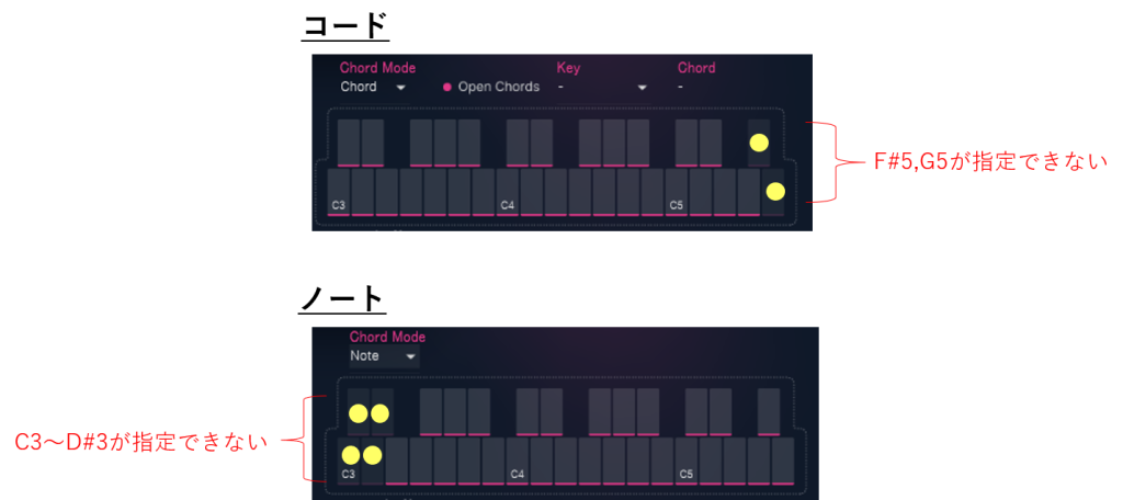 実は、両モードでC3~F5のキーが全て指定可能になっているわけではなく、コードとノートで指定可能な範囲が以下の図のように異なります。まあ、コードは基音(1度)と3度、5度のように組み合わせて和音を構成しないとならないので当たり前なんですが。。