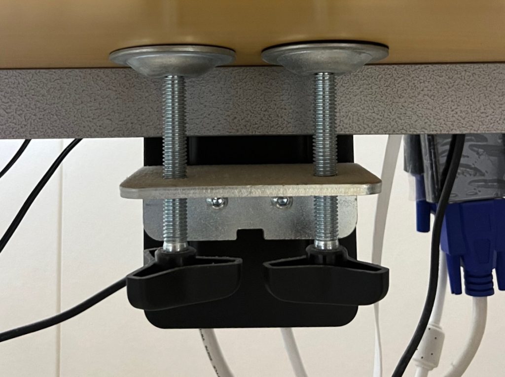 モニターアームを机に取り付けるためのネジは、大型のものが2つあって、ガッチリと机に固定できます。こちらはVESA規格とはなんの関係もありません。