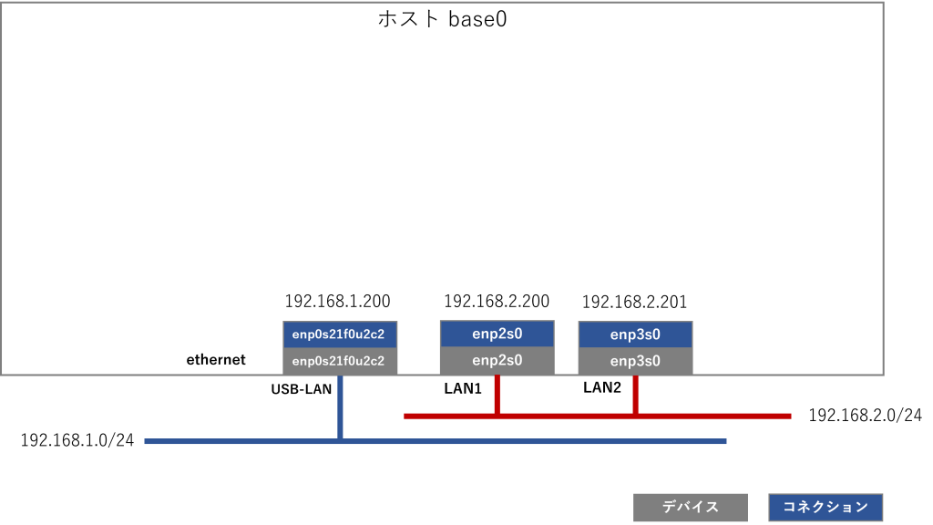 この接続形態では、LAN1とLAN2のそれぞれのコネクション(type=ethernet)がIPアドレスを持ちます。