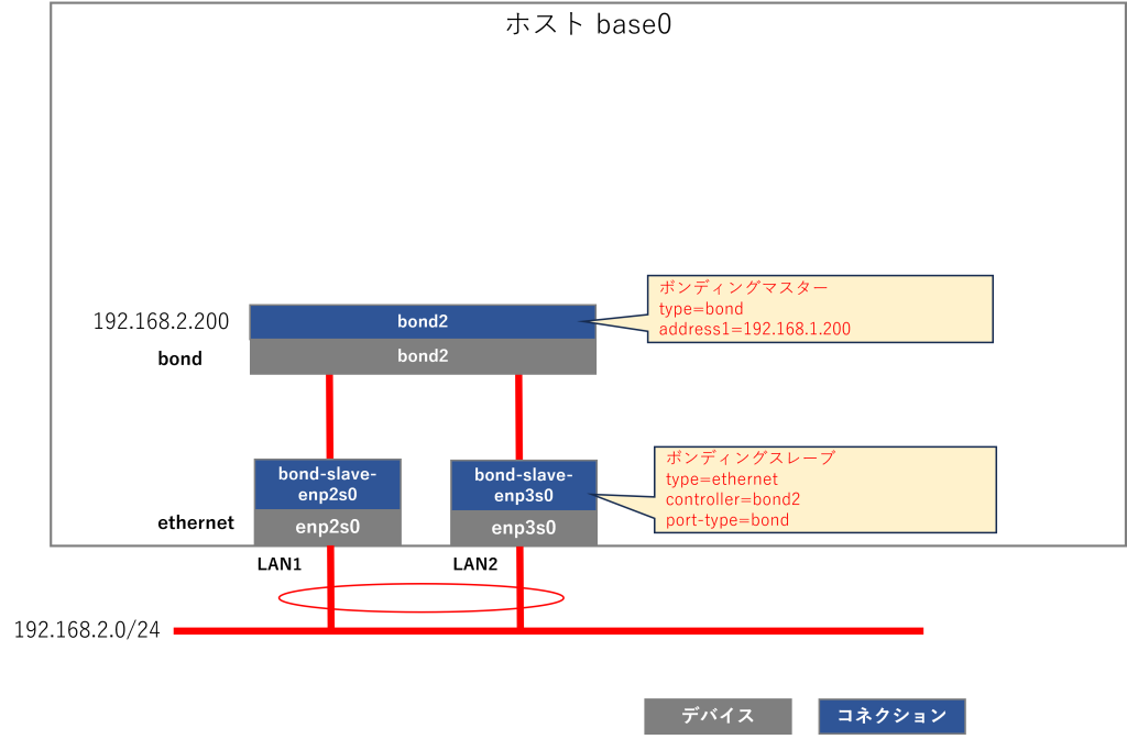 ボンディングする場合は、bondingの論理インターフェースを作成します(名前はbond2とします)。登場するインターフェースは、enp2s0(LAN1)、enp3s0(LAN2)、bond2 の3つとなります。そして、それぞれのインターフェースがコネクションを持っています。enp2s0とenp3s0は、type=ethernetとして作成しますが、ボンディング bond2に接続するボンディングスレーブの役割を持たせます。今回の例では、分かりやすいようにコネクションの名前を変えています。そして、IPアドレスはボンディングマスターとなるbond2のほうに割り当てます。