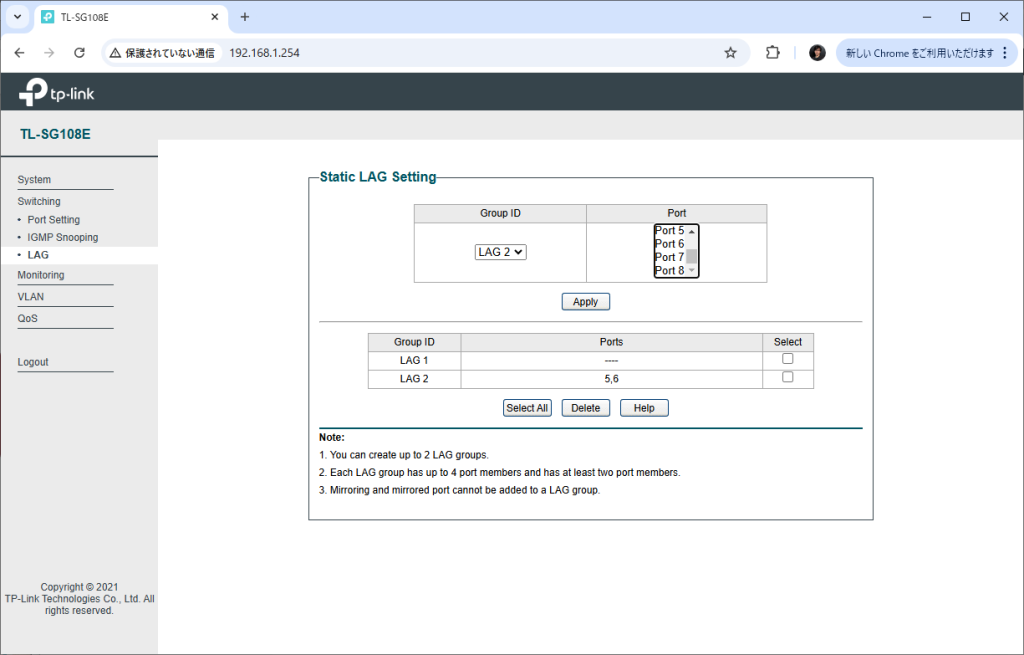 ウチのネットワークスイッチ tp-link製TL-SG108E はLAGに対応しているので、LAN1,LAN2と接続しているPort 5-6をLAGに設定しました。
