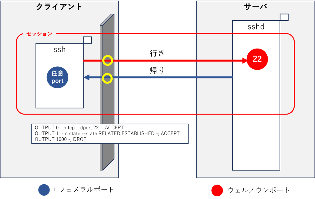 しかし、この設定だけでは、サーバからクライアントに帰る通信は22番以外の任意ポート(エフェメラルポート)になるので、拒否されてしまいます。