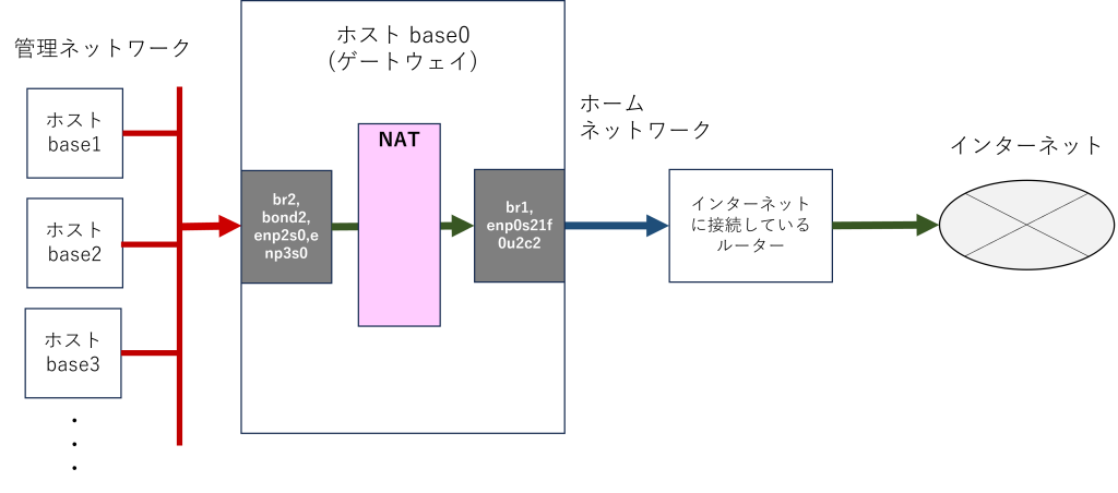 一方で、管理ネットワークに接続しているホストbase1~baseNは、ホストbase0をゲートウェイ(ルーター)として機能させることで、「base1~N→base0 → ホームルーター → インターネット」の経路でインターネットに接続することができます。base0をルーターとして機能させる設定についてはコチラをご覧ください。