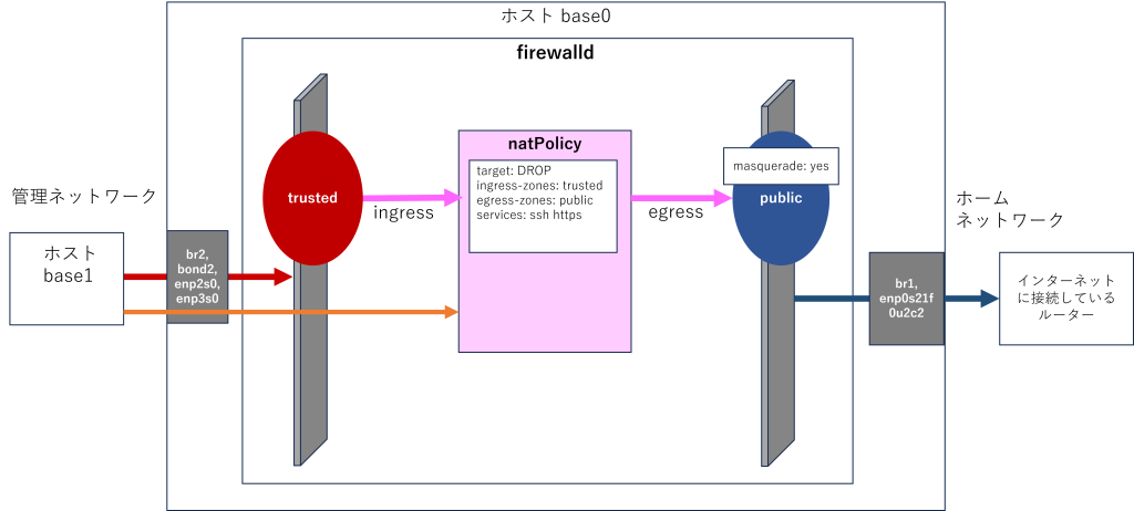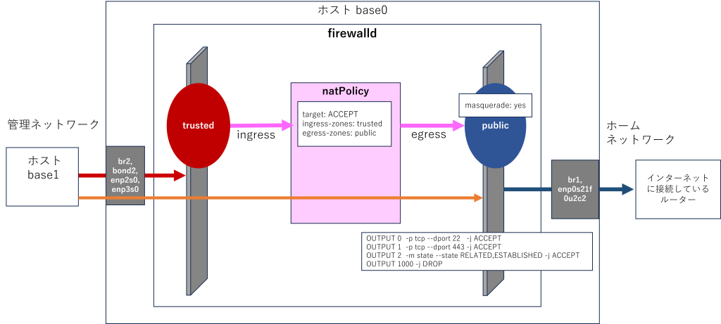 この設定によって、ホストbase0からホームネットワークへのoutboundのアクセス制限は予想した通りになりましたが、base1からbase0でNATしてホームネットワークに接続するアクセスは、まったく制限がかかりませんでした(笑)。作戦失敗。。。