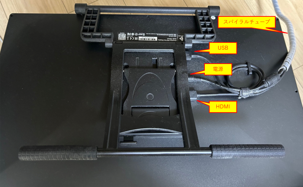 そんな訳で、分配器(USB to USB,HDMI)を別途購入して、PCにはUSB 1本で接続できるようにしています。また、3本ケーブルは、スパイラルチューブでまとめてすっきりさせています。