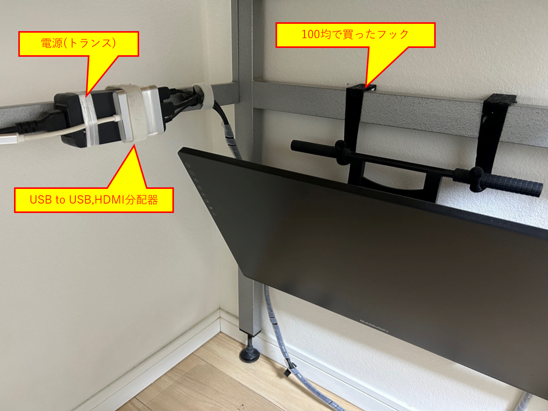 100均で購入したフックを使って、机の下につり下げるようにしています。電源のトランス部とUSB to USB,HDMI分配器も机に固定しています。