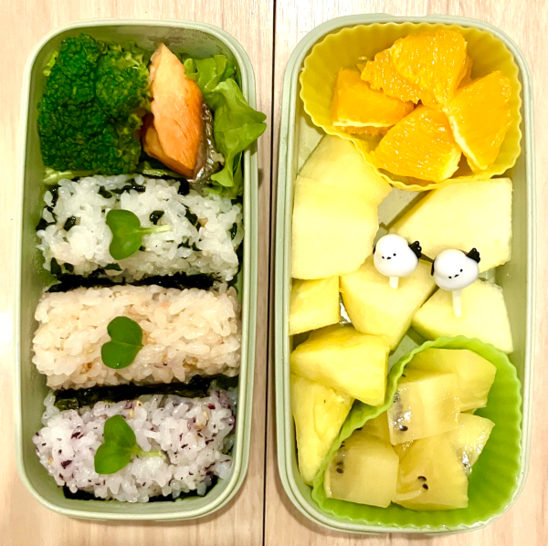・全体に淡色が多いので、ブロッコリの緑とシャケのオレンジがコントラストを引き立てています。