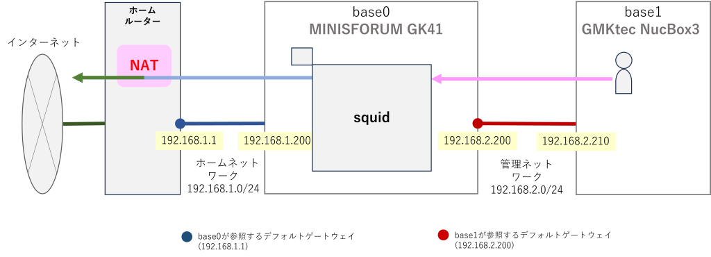 ウチには2台のミニPCがあります。base0というホストは、ホームネットワーク(192.168.1.0/24)に接続されており、ホームルータを経由(NAT)してインターネット上のhttp/httpsサーバにアクセスができます。もう1台のbase1というホストは、管理ネットワーク(192.168.2.0/24)に接続しているだけなので、インターネットにはアクセスできません。
