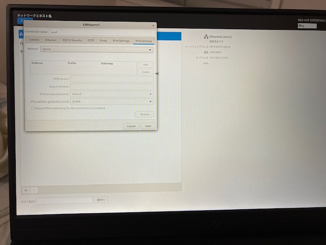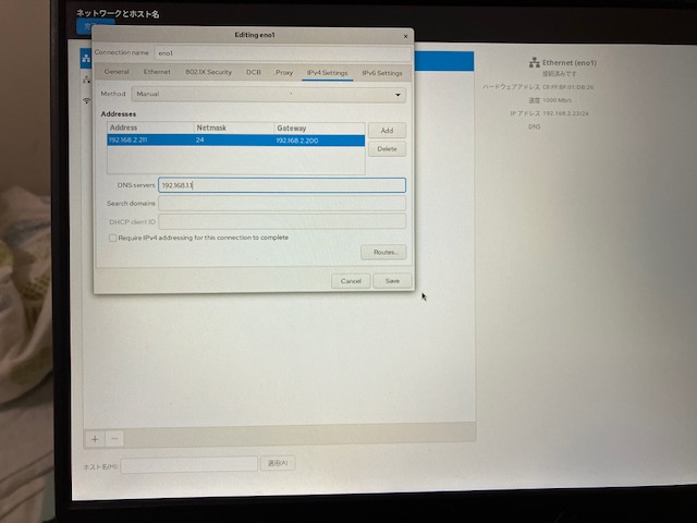 Ethernet (eno1)の設定ダイアログが表示されます。