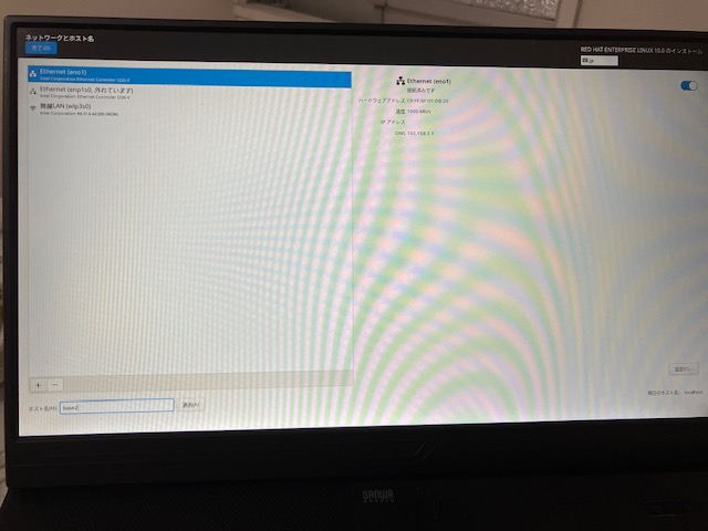 ちなみに、このインストール作業の前に、このミニPCは管理ネットワーク(192.168.2.0/24)に接続しており、管理ネットワーク上ではDHCPサーバを稼働させています。そのような訳で、「ネットワークとホスト名」の画面に来たときには、既にIPアドレス 192.168.2.23 が割り当てられている状態でした。