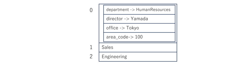 1.①のシーケンスデータの最初の要素に、マッピングのデータを格納してみましょう。シーケンスの最初の要素を入れ子にして、1.②のマッピングデータを格納します。部門の名前が分からなくなってしまうので、キー departmentを追加しています。